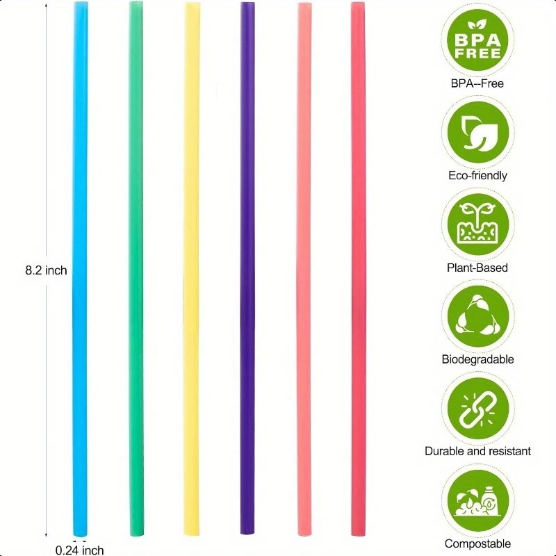1. Material: PLA 2. Eco-friendly:100% degradable within 90-180 days 3. Color: Red, Blue, Yellow, Pink or Custom Pantone 4. Size: 6*210mm, 6*260mm or custom size 5. Advantage: Plant based, Renewable, Compostable 6. Application: Restaraunt, Cafe, Milk tea shop,Bars etc